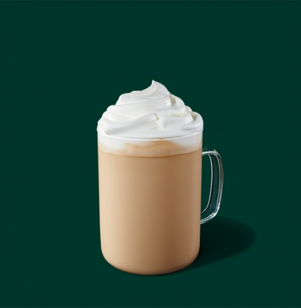 Yeşil arka plandan oluşan fotoğrafın odak noktasında bir bardak white mocha yer alıyor. Şeffaf, kulplu bir bardakta sunulmuş. Kahve ve beyaz çikolata sosundan oluşan genelde sıcak tüketilen bir içecek olan white mochanın üzerine dört parmak kalınlığında krema sıkılmış. Kahvenin rengi ise süt eklendiğinden krem rengindedir.