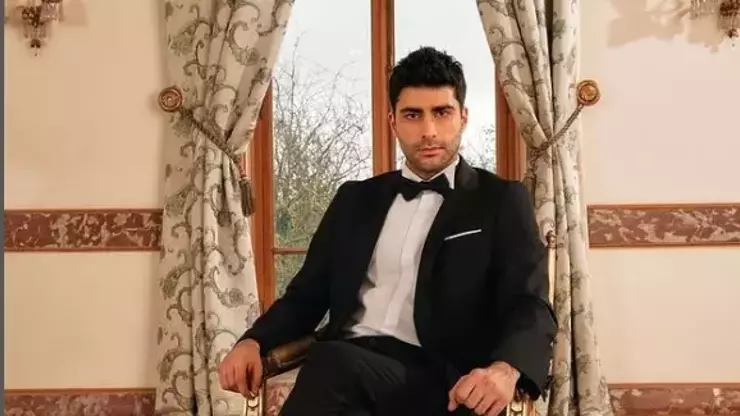 İlk iki düğmesi açık lacivert bir gömlek giyiyor. Sol omzunda aksesuar olarak bir çanta askısı dikkat çekiyor.