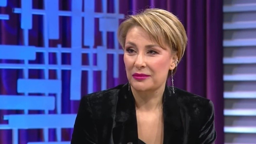 Meral Çetinkaya’nın kameraya dönük ve düz durarak poz verdiği, göğüsten yukarısını kadraja alan, yakın çekim, renkli bir fotoğraf. Arka planda, eski bir duvar görülmekte.