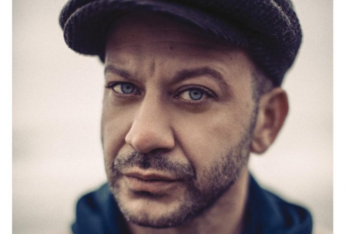 Edis Görgülü’nün göğüsten yukarısını kadraja alan, renkli bir fotoğraf. Arka plan mavi ile yeşil arasında, gölgesi düştüğü için biraz koyu bir renkte.