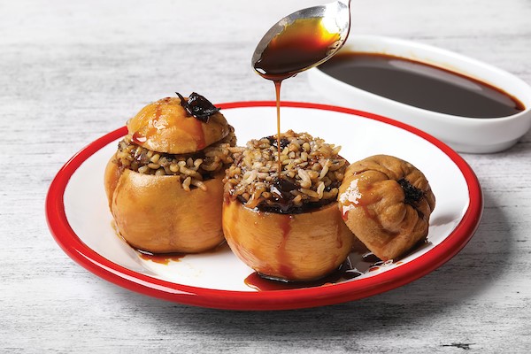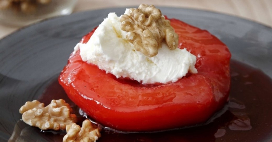 Enine dikdörtgen şeklindeki bu fotoğrafta, alt kenara daha yakın olarak tam odaklanmış kenarı kırmızı, beyaz, yuvarlak tabağın içinde iki adet ayva dolması var. Ayvaların üzerinden bir parça kesilmiş, içleri; kıyma, pirinç, salça, soğan, maydanoz ve baharatlardan oluşan bir harçla doldurulmuş. Üst taraftan kesilen parçalar aynı zamanda dolmaların kapağı olarak kullanılmış. Kabuklu olarak pişirilen ayva dolmalarının iç harcı pişince ayva dolmalarının iç harcı pişince hacimce yukarı çıkmış. Soldaki dolma, kapaklı olarak yanlarından akan pekmezi ile biraz daha arkada. Sağdaki daha önde kapağı sağ yanına düşmüş ve üzerine sapı kadrajda olmayan bir kaşıktan pekmez dökülüyor. Pekmez kasesi ise dolma tabağının sağ arkasına yerleştirilmiş.