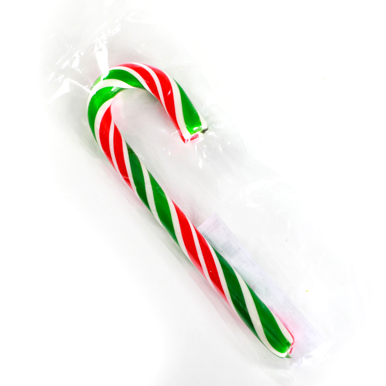 Fotoğrafta beyaz arka planın üzerinde paketlenmiş baston şekeri yer almaktadır. Şekil olarak ters J harfine benzeyen bu şeker; resimde kıvrımlı kısmı yukarıda kalacak şekilde koyulmuş.
