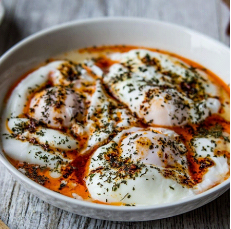 Kare şeklinde yatay olarak fotoğraflanmış görselde tahta bir masanın üzerinde yukarıdan çekilmiş olan Çılbır büyük, beyaz seramik bir kasenin içinde üç tane konumlanmıştır. Çılbır’ın beyaz olan yerleri her yeri kaplamış olmasına rağmen sarıları hafifçe seçiliyor. Çılbırların üstünde sulu bir salça sosu ve yoğurt var ve baharat olarak kekik ve pul biber bulunuyor. Kasenin yarısından fazlası Çılbır ile dolu olup sosun suyu kaplamaktadır.