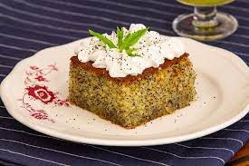 Gri, beyaz çizgili masa örtüsünün üzerinde, beyaz bir tarafı kırmızı çiçek motifli tabakta sunulmuş bir dilim haşhaşlı revanı var. Şerbetle ıslatılmış bir çeşit kek olan bir tatlı olan revaninin ana rengi sarı ve içerisinde siyah minik noktacıklar halinde duran haşhaşlar var. Tatlının üst kısmı kahverengi ve onun üzerine de bir parmak kalınlığında beyaz bir krema eklenmiş. Kremanın üzerine ise haşhaşlar serpilmiş ve bir sap nane eklenmiş.