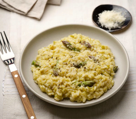 Fotoğrafta bir İtalyan yemeği olan Risotto görülmektedir. Açık sarı renginde olan risotta yumuşak bir dokuya sahiptir. Risotto tabağı fotoğrafın odak noktasındadır. Risottonun üzerine taze kuşkonmazlar konulmuş, görsel açıdan çekici ve iştah açıcı bir yemek ortaya çıkmıştır. Beyaz sade oval tabağın etrafında metal daire işlemeli tahta saplı bir çatal, ufak siyah bir kase ve kasede rendelenmiş parmesan peyniri bulunmaktadır. Bıçak görüntünün sol tarafına dikey olarak, kase ise ortasına yatay olarak yerleştirilmiştir. Bej bir sunum bezinin üstünde olup ek olarak fotoğrafın sol üstünde başka katlanmış bir bez gözükmektedir.