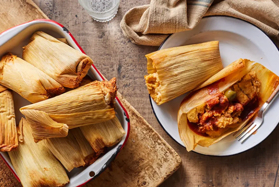 Yatay dikdörtgen şeklindeki fotoğrafın yaklaşık olarak sol yarısında; eskitme ahşap üzerinde ahşap bir kesme tahtası, onun da üzerinde içerisinde Latin Amerika kökenli, mısır yapraklarının içi doldurularak yapılan bir yemek olan tamalenin yer aldığı bir fırın kabı bulunmakta.Fotoğrafın sağ yarısında ise beyaz renk bir tabak içerisinde içi açılmış bir tamale, henüz halen kapalı bir tamale ve bir de çatal yer alıyor. Bu beyaz tabağın hemen üzerinde krem renk bir mutfak bezi bulunmakta.