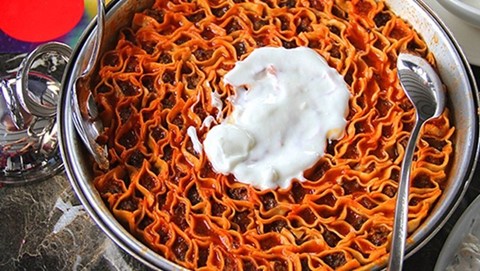 renkteki yemeğin yağı, açık renkteki kuzu eti, nohut ve pırasa konulmuş Şiveydiz Yemeği